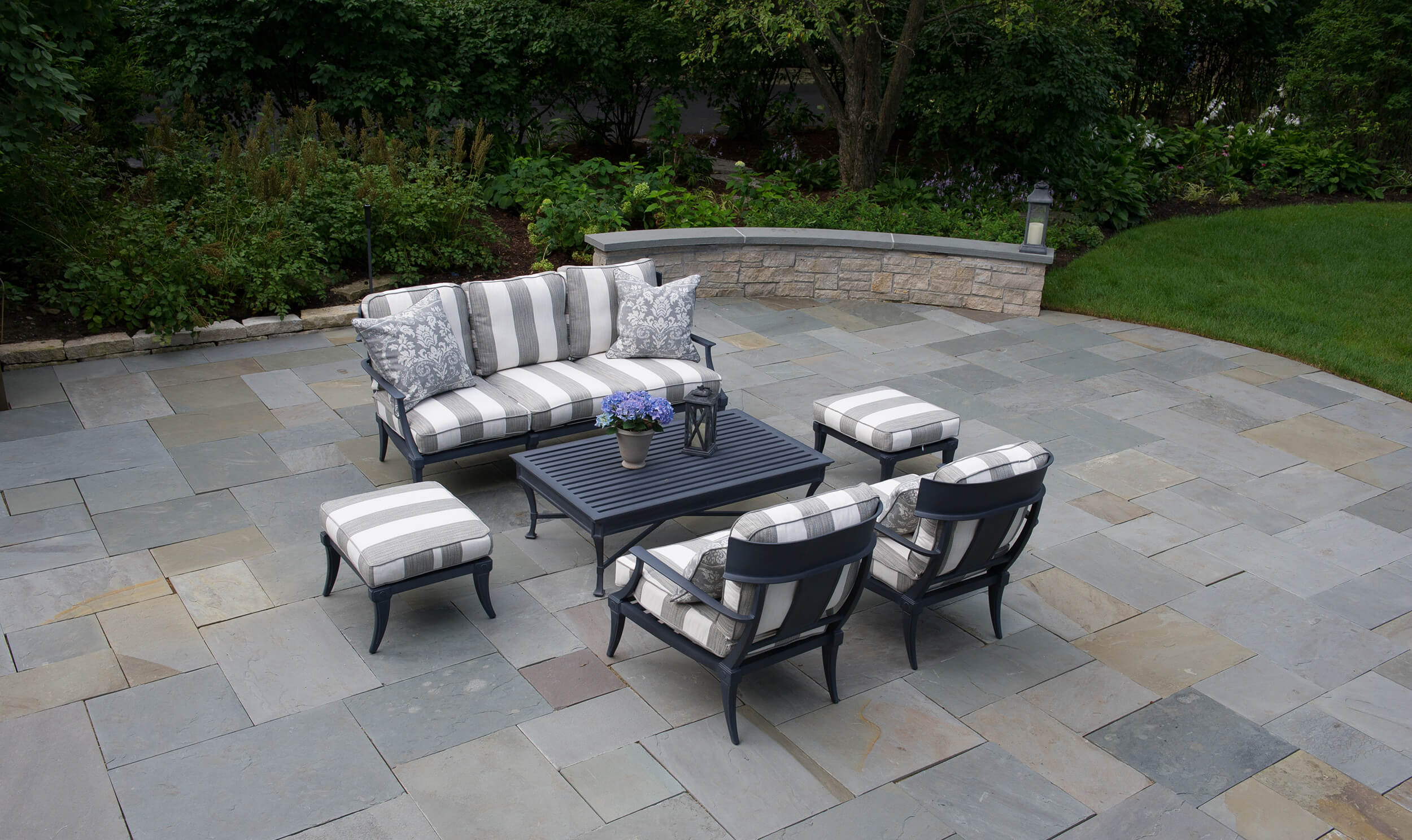 Within the walled landscape, a set of bluestone patios offer ample space for outdoor entertaining. The patios were designed with curved outer edges and a mirrored pair of seatwalls that repeat the curved shape of the estate wall. Projecting into the elongated lawn, the patios offer a private haven from which to applaud a game of badminton or admire the flowing garden borders.