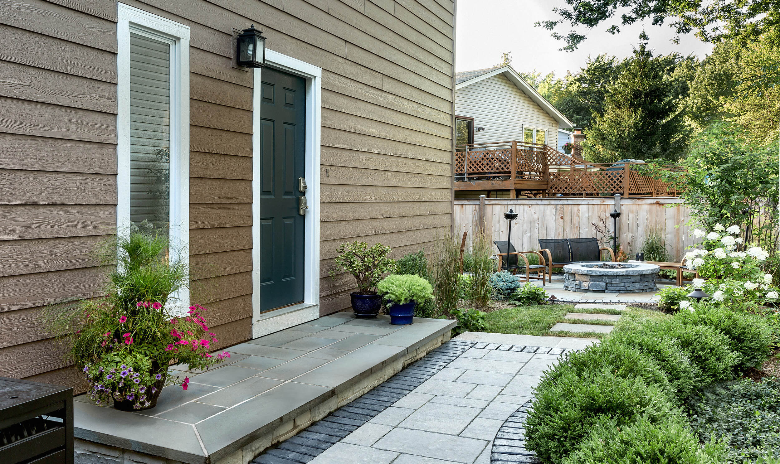 In the back corner, a gas firepit sits in the center of a circular bluestone patio. The homeowners, both engineers, expressed a strong affinity for the beauty of natural stone and took great interest in selecting the oxide/brown coloration and patterning of the full-range bluestone used around the firepit and on the stoops.